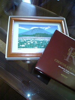 グアムの仕事でお世話になってるミツモリさんから北海道のお土産が届きましたぁ!一つはROYSのホットチョコレート!もう一つは本間武男さんが描いた素敵ながくに入った富士山の絵!しかも他に色んな季節の富士山の絵が四枚も入ってて気分によって変えられるの!嬉しいー(^0^)/永海ホットチョコレート大好き!この絵もとっても好きです!ミツモリさんありがとうございます!ってそろそろジムに行かなきゃ。朝からルンルン、頑張るぞー。