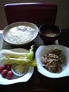 お昼ご飯作ったよ。冷蔵庫の中にあった物(^0^)/豚のしゃぶ肉はオイスターソース炒め、野菜はたっぷりセロリとトマト、それから素麺にたれがなかったから白だしと少しのお醤油を薄めて作ったよ。お腹いっぱい(^0^)/