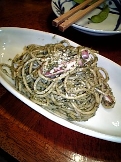 昨日はKの家にお邪魔して夜ご飯をごちそうになったよー。メインは麻理子のお父さんが釣った沢山の鱚!それをKのおねえちゃんがムニエル、そして梅煮みたいにしてくれて超美味しかったo(^-^)o後手作りバジルペーストの冷製パスタにパプリカのカルパッチョ風、冷製のパンプキンスープココナッツ風味におばちゃんの作ったきゅうりとなすと唐辛子の和え物にピザとたーくさんあったよー。お腹いっぱい!デザートはちなみにラフランスとダークチェリーのタルトを少しづつ切ってハーゲンダッツのアイスクリームと食べたの!って又食べ物の話f^_^;だってさあ、美味しいんだもん!さーて今週は食べ過ぎない様にしよーっと。写真は手作りバジルペーストの冷製パスタだよー。