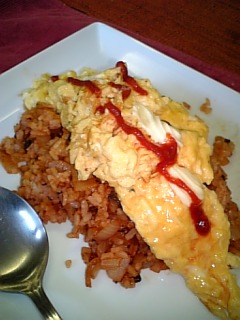 レコーディングが早く終わったので、一度家に帰ってお昼にオムライスを作ったよ。玉葱とマッシュルームを刻んで炒めて、ご飯と塩こしょう、ケチャップを入れてケチャップライスに。それから別のフライパンに卵と牛乳、塩こしょうした物を半熟にしてライスの上に乗せたよ。お腹いっぱい!さーて、また出かけてきまーす。