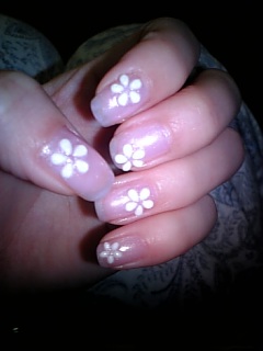 久々に自分でネイルをやってみました。細かい事が苦手な私としてはマニキュア一つ塗るのも大変だからいつもネイリストさんにお願いしてるんだけど、たまには自分でやろうかなーって。乾かすまでが時間かかるね。うすーいピンクを塗った後にシールの花を付けてみたよ。どう?お風呂入っても無事な事を祈るわ。。。しかし女の子は大変だ。今爪にオイルもちゃんと付けてちょっとおいてる所。今台本チェックが終わり、たまには12時前に寝ようかなあ。今週末は朝一番で勉強会があるし寝れないし。たまには思いっきり寝たいなー。寝るの大好き!