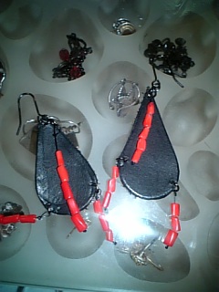 このピアスはなみがデサインして作った物。作ったと言うより作ってもらった。。。かな。黒い部分は革なの。そして赤い細長いビーズをランダムに付けたよ。以外と存在感あって良い感じ。つけるととっても可愛いんだよ。