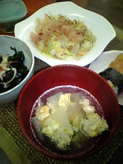 これは一昨日の晩御飯。キャベツのおかか炒めにわかめとみょうがのポンズ和え、鶏肉団子の大根と卵のスープに、あまりもののふとまきとおいなりさん。日本食が1番美味しい(^?^)