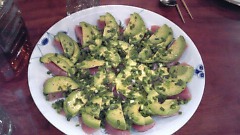 てっちの家に鮪の刺身のでっかい切り身があったので、ってさ普通ないけど、アボガドとばんねぎの乗せて、カルパッチョを作って食べたよ。めっちゃ美味い(o^?^o)