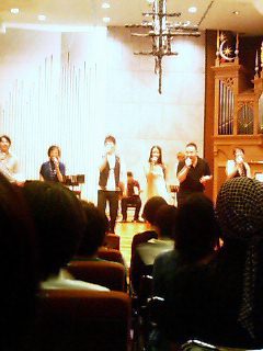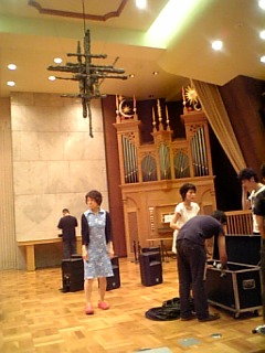 この写真の二人の顔に笑ってしまった(^O^)大塚利恵ちゃんと。ただいま市ヶ谷ルーテル教会で搬入しており、軽くマイクなどの音を確認しております。さっきは近くのDenny'sで皆で腹ごしらえしました。ちょっと声を出してみては怒られたり。。f^_^;直前までこんな感じです。