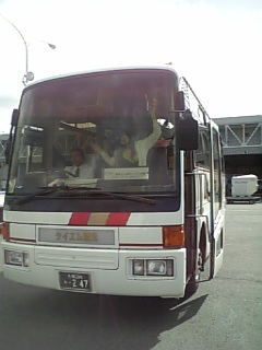 空港からは貸し切りバスで移動。途中で楽器をある場所でピックアップ。バスの中でポーズをとってるのは香りちゃん。