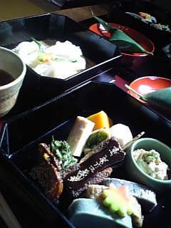 日曜日の12時台の新幹線で京都へ。Free TEMPO京都ツアー。ちょっと早く着いたので、品川駅で一人お茶を飲んでいたら、名取香りちゃんとマネージャー早川さんとバッタリ。半沢さんにもバッタリ。って言うか皆同じ場所に行くんだもんね。そのまま新幹線乗り場へ移動して新幹線に乗りました。香りちゃんはいつも通りそっこう寝て、私はiPod聞いてたら目がさえてしまって結局ずっと起きてたよ。京都でそのまま箱入りしサウンドチェック。そこで、AYAちゃん、Ogurusuさん、SHEEANと合流。その後はホテルにチェックIN。集合時間まで2時間あったので、ホテルの近場のお豆腐レストランで腹ごしらえしました。AYAちゃんと香りちゃんと早川さんと。皆豆腐ハンバーグ定食。あっという間に間食!