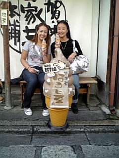 ふまんじゅうもしっかりお土産に買った後は、てくてく歩いて、途中にほうじ茶ソフトを見付けて二人で気付いたらお金払って買ってましたf^_^;お店のおじさんが写真を撮ってくれたよ。ソフト人形??と一緒に!