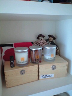 私のアロマテラピーボックス達。一つは妊婦さんには使えないアロマシリーズ、もう一つは誰でも大丈夫なの。知らないで何でもかんでも使ったら大変な事になるからね。後ろは昔ベネチアで買った仮面舞踏会の職人さんがペイントした鏡と、marimekkoのオープニングパーティーで父がもらって来た壁かけ。それにアロマキャンドル。今日も帰ったらつけよう。