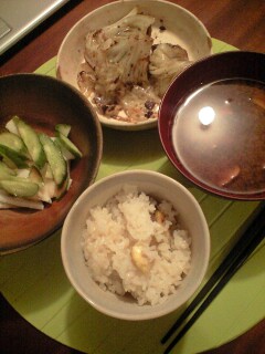今夜はゴマレバキャベツ炒めと、皆口裕子姉ちゃんからもらった玄米味噌で作ったえりんぎの味噌汁に、山芋とキュウリのポン酢和えと栗ご飯。栗むくの凄い大変だった…でもそのかいあって餅米とブレンドして作った栗ご飯はとっても美味しく出来たよー。