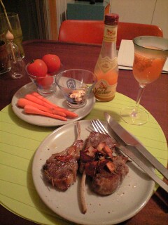 前の残りのラム肉のハーブガーリックオイル漬けを冷凍庫から発見したのでそれを焼いて、野菜を少しとオレンジのカクテルをチビチビやりながら夜景見ていますよ。本当はワインのみたかったけど、なかった…これ見てたらそうとう寂しい人っぽいけど…(Θ_Θ)