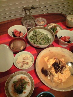 写真はある晩のご飯。お芋入りご飯に椎茸のお味噌汁、菜の花のお浸しに、大根と人参の葉とじゃこの炒めた物に卵が沢山あったので、たっぷりの出汁とほんの少しのお砂糖とお酒でゆるめの卵焼きを。その上に椎茸のあんかけをたっぷりかけて頂きました。こんな風に、お肉が一つもない日が沢山ありますが、全然問題なし。ただ食べたい時はがっつり食べますよ。何だかんだ、家ご飯が一番好きな私です。