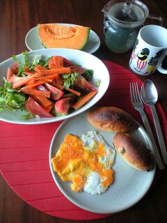 今朝もいつもな感じでサラダ(キャベツ、イタリアンパセリ、ルッコラ、クレソン、人参にトマト)、卵にTom's sandwichさんに頂いたパン、そしてメロン一(#^-^#)ハーブティーはマローブルーとマローブラックをブレンドした物にしました。喉に良いマローブルーにマローブラック。今週も毎日声を使うので。本当にハーブは美味しいです。さて今日もレコーディング。頑張って行って来ます!